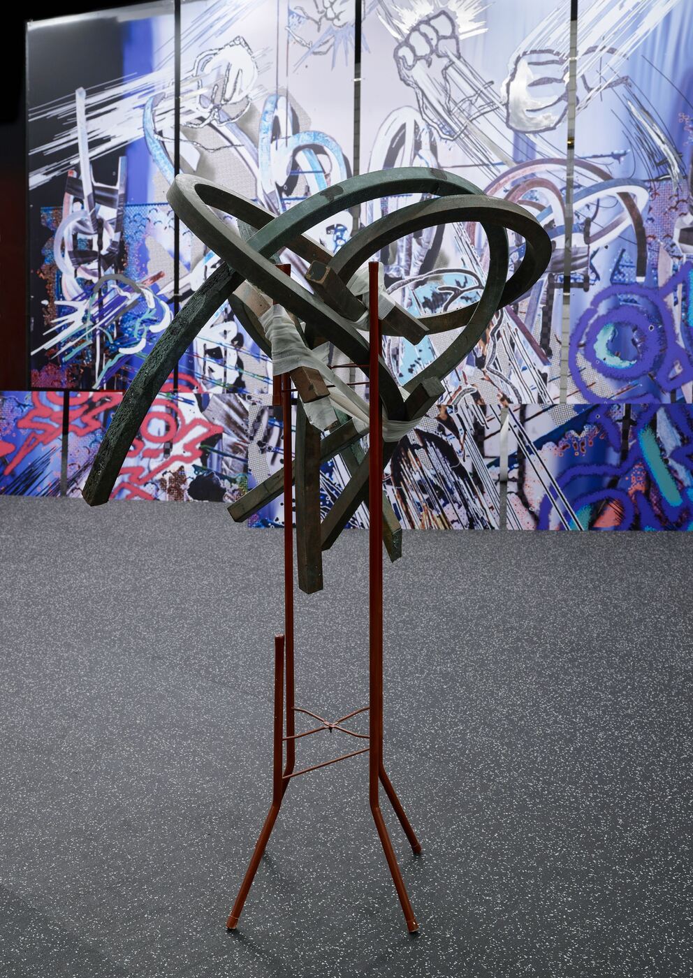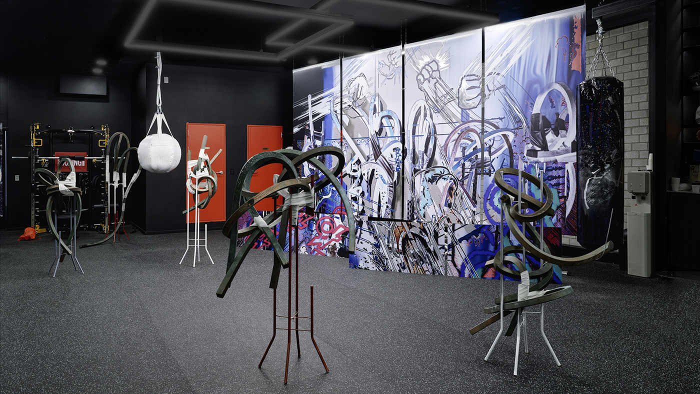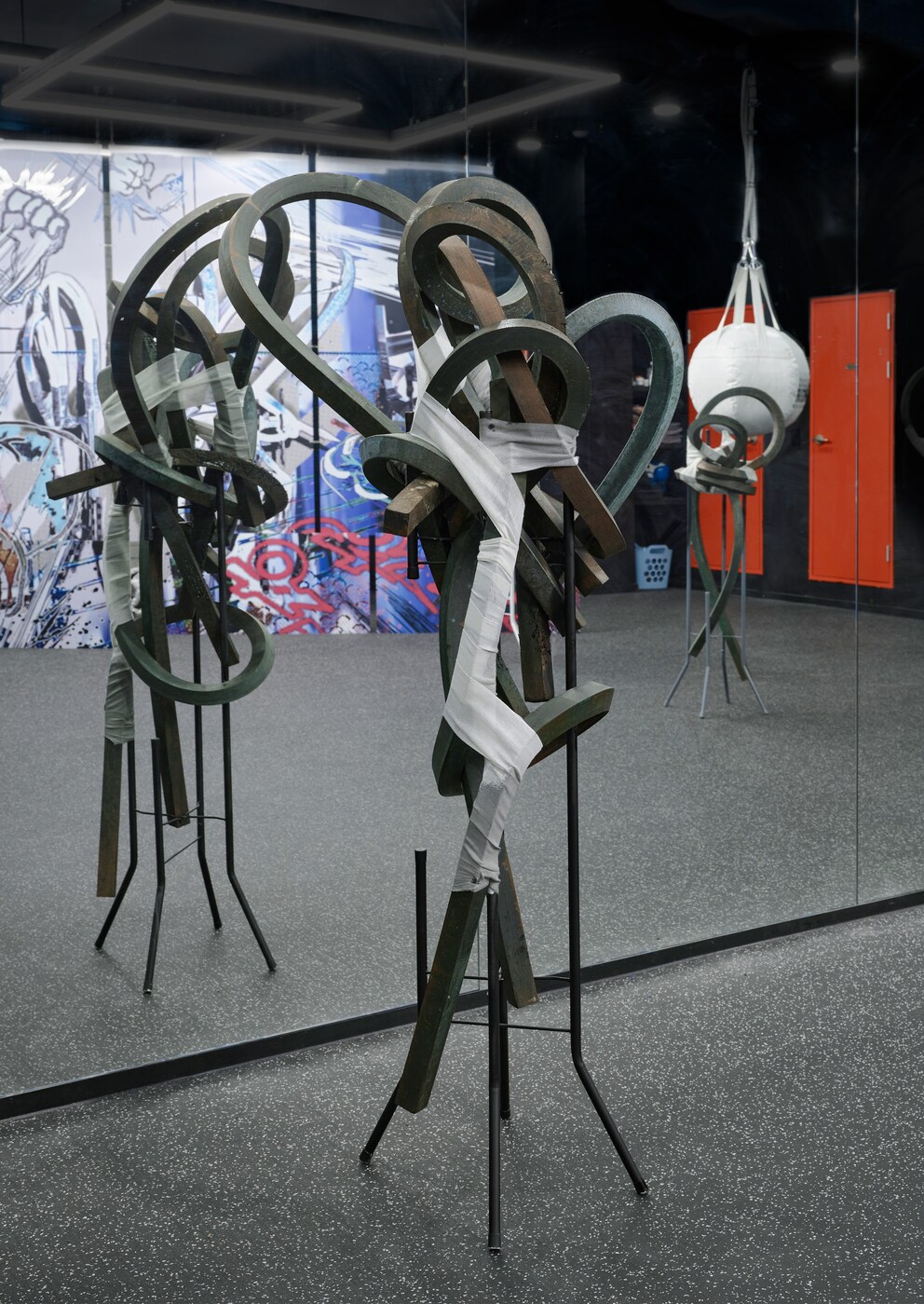 Friends (one-two-hook-upper-weaving- long) 2024 Sponge, bandage, steel pipe with Digital drawings Simjae Boxing Studio, Seoul, Korea