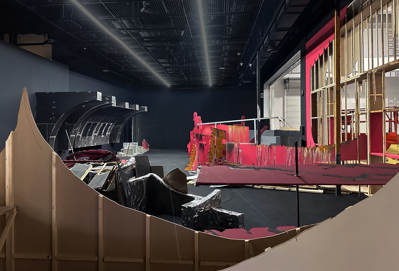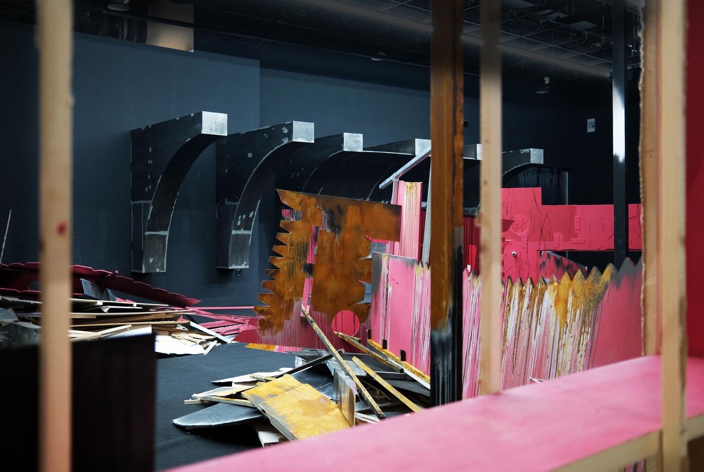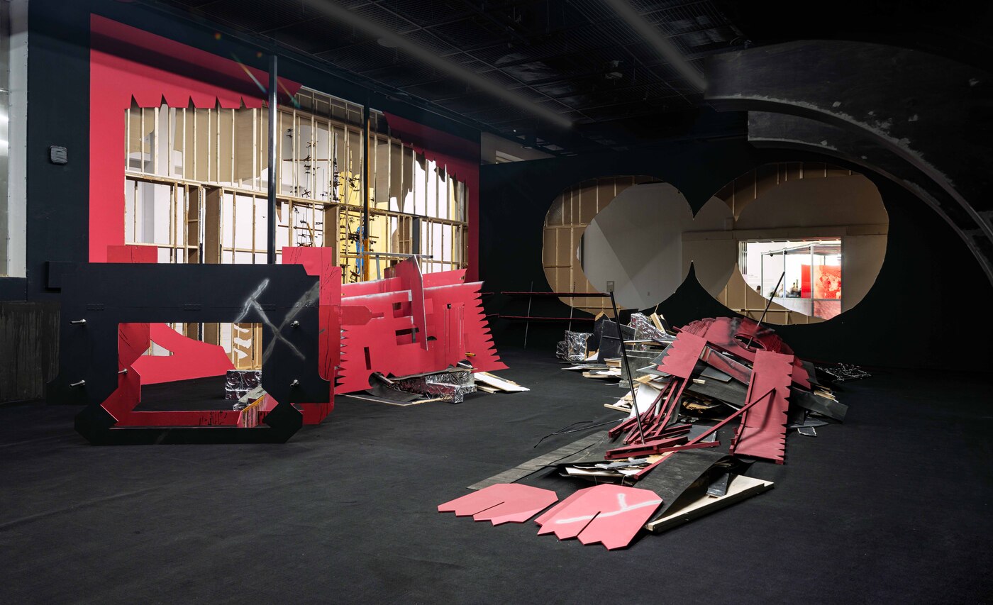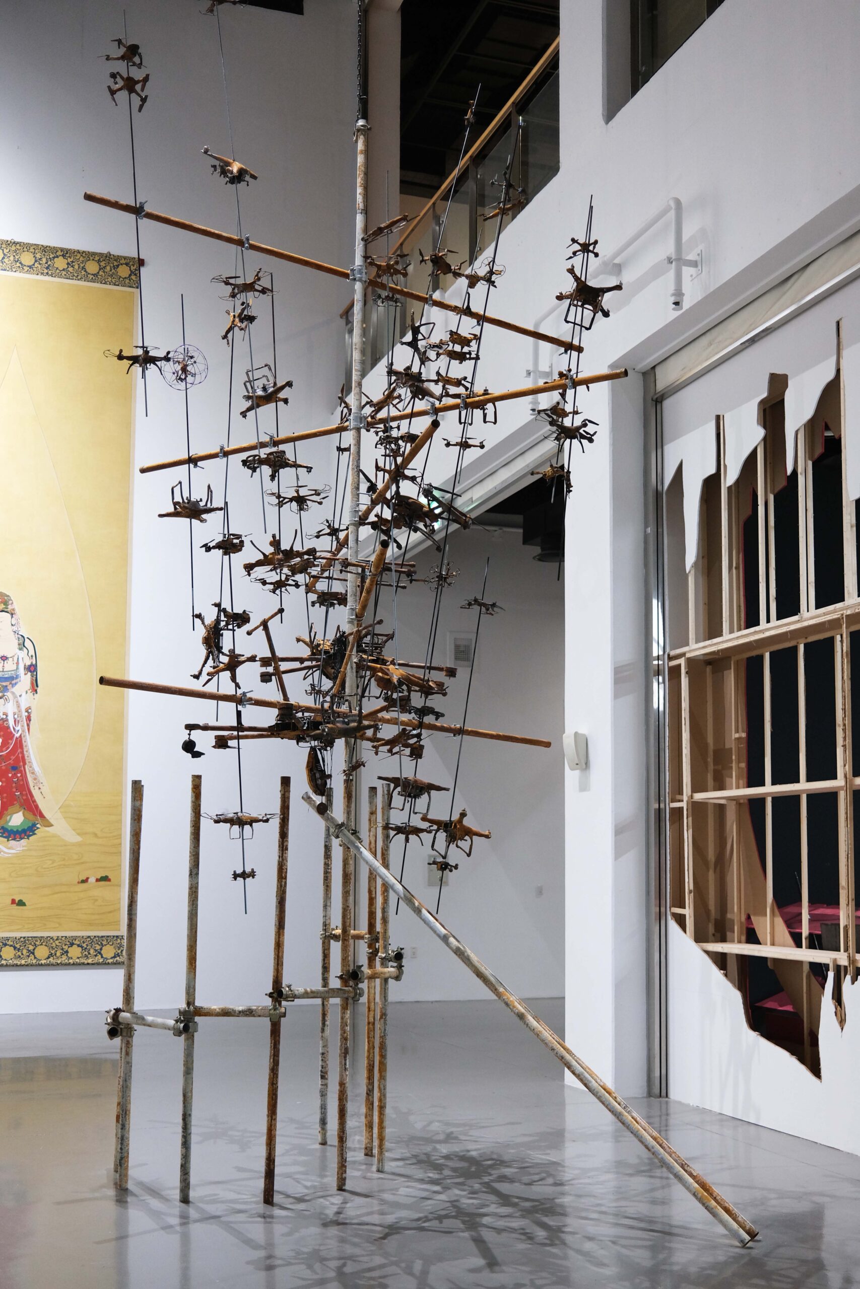 W💀W (Waves of Wreckage) 2024 Broken temporary walls, malfunctioning drones, MDF plywoods, cement, stainless steel pipes, and other mixed materials 196 x 314 x 393 in. Busan Biennale, 2024, Busan, Korea